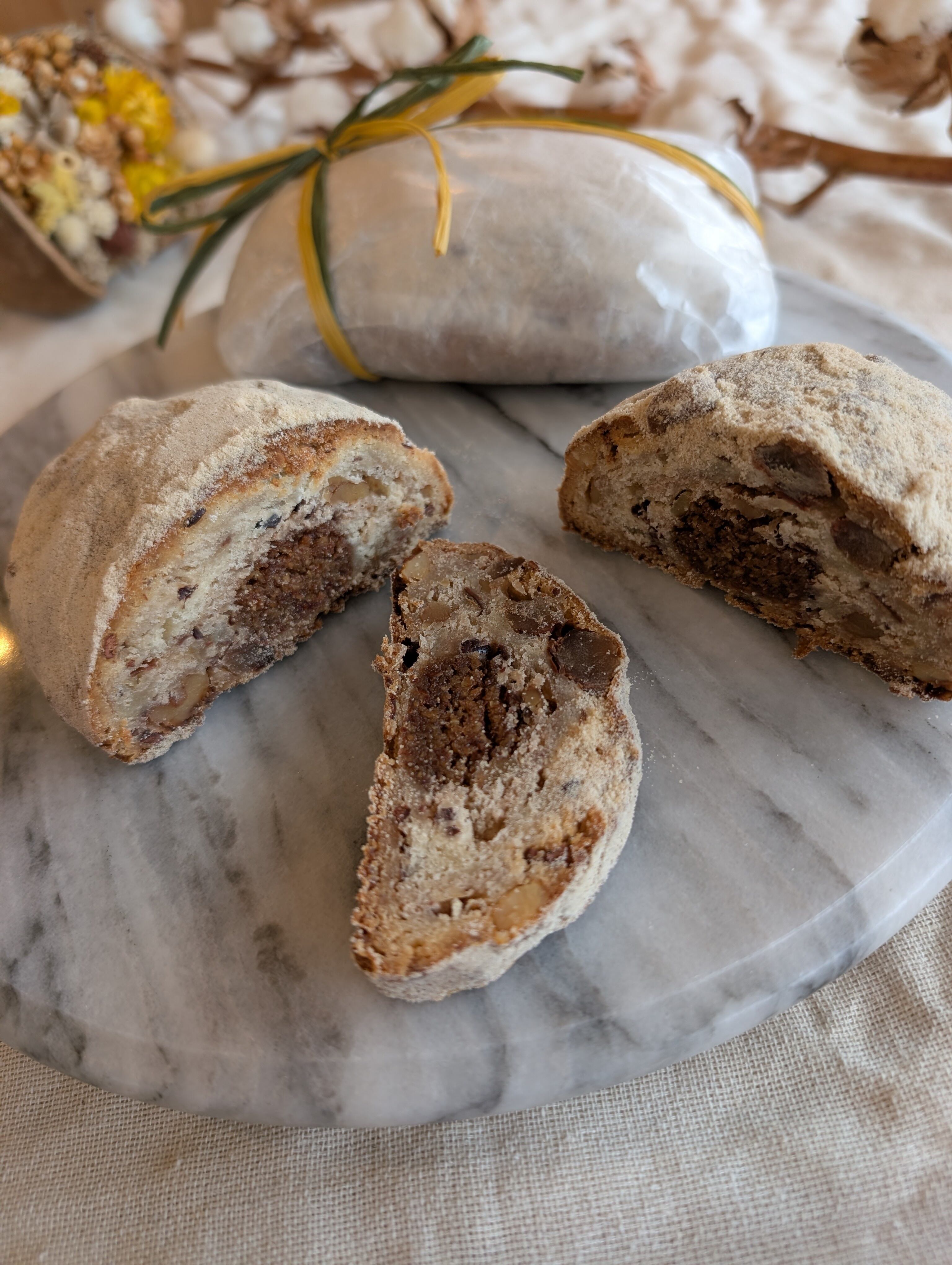 じっくりと洋酒に漬け込んだドライフルーツとナッツをたっぷり詰め込みました。中心には、ローストアーモンドで作った自家製のマジパン。生地は、酵母や乳製品の奥深いコクを感じられるしっとり熟成された仕上がりに。仕上げにバニラシュガーを纏います。ラム酒や赤ワインが香るジューシーなフルーツとねっとり濃厚なマジパンが調和した大人のご褒美。